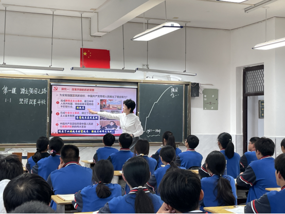 此次交流研讨分为两个环节。第一个环节是观摩荆南中学思政课教师公开课。在课堂上,授课老师就坚持改革开放创设了一系列的问题,以探究式的方式,激发学生主动思考和主动学习,让学生在解决问题的过程学会学习,主动担当,不自觉中提升了学生的六大素养,呈现了现代教育理念指导下的高质量的示范课。