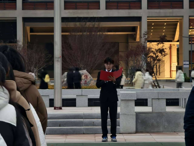 升旗仪式结束后,学生代表王长翔在国旗下发言,表达了新时代青年大学生坚守革命先辈的意志,挺膺向前的决心。