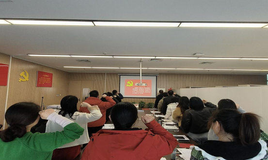 在李天赐老师的领誓下,全体党员面向党旗,高举右拳,重温入党誓词,并集中诵读了《中国共产党章程》第三章部分内容,现场缴纳了党费,进一步强化了党员身份意识和组织观念。