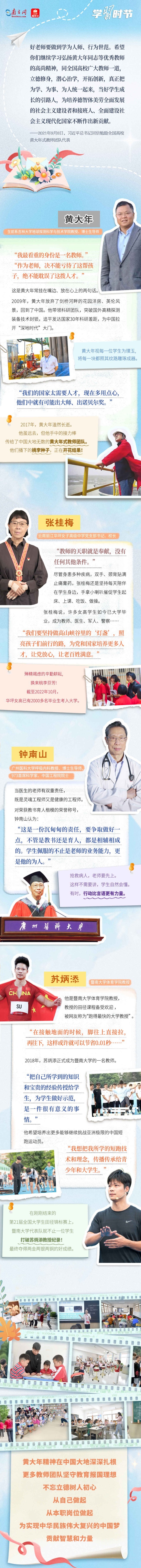 “三寸粉笔,三尺讲台系国运;一颗丹心,一生秉烛铸民魂。”教师承载着传播知识、传播思想、传播真理,塑造灵魂、塑造生命、塑造新人的时代重任。广大教师耕耘在不同的教育领域,用各自不同的方式,诠释对于教师责任的理解,立德树人,争做新时代“四有好老师”,用爱与奉献描摹出一幅生动的当代中国教师群像。让我们向他们致敬,并送上诚挚的祝福:“老师,谢谢您,祝教师节快乐!”
