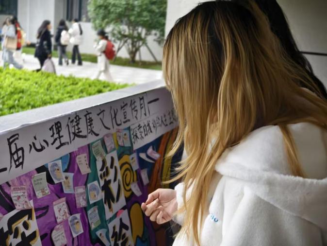 在室外心理健康宣传活动中,前来参与活动的同学们在心情驿站爱心展板上书写对自己的寄语和鼓励;在心理知识抢答的小游戏环节中,现场氛围浓厚。