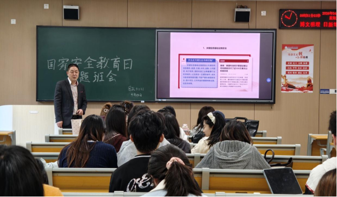 活动当天,学院各班级分别召开主题班会,围绕国家安全开展专题学习。在思政5231班,班主任郭世德老师通过PPT系统讲解了国家安全的重点领域,并结合现实案例,提醒同学们警惕兼职陷阱与境外渗透风险。思政5241班班主任史苗苗老师为同学们介绍了全民国家安全教育日的设立背景与意义,辅导员李天赐老师则结合多个领域的真实案例,剖析了危害国家安全行为的形式与后果,增强学生的法治意识和防范能力。思政5251班班主任任文慧老师则围绕国家安全教育相关知识深入浅出地为同学们讲解了国家安全的重要性。