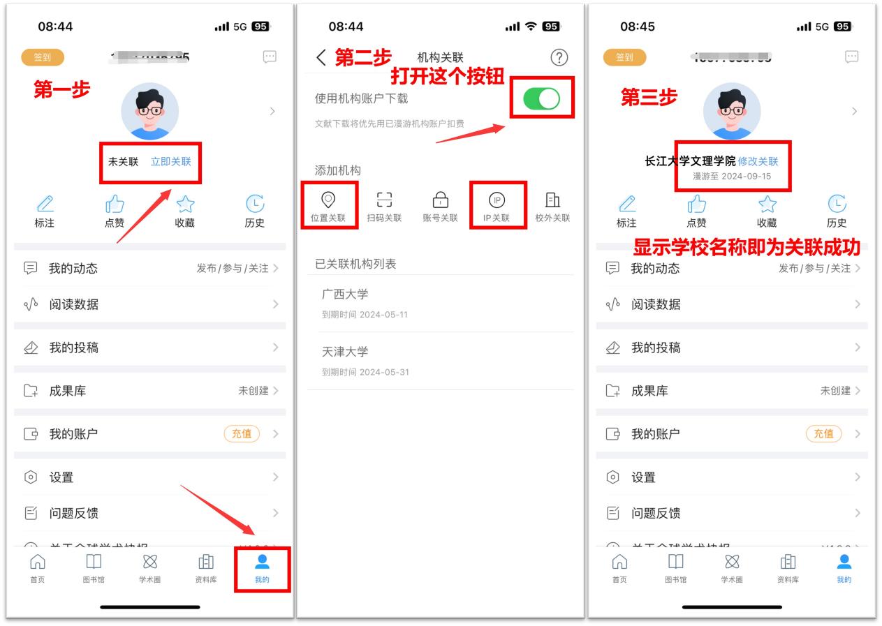 ②IP关联:手机连接校园网后点击“IP关联”即可关联成功。关联成功后任何网络不限IP可免费使用学校采购的知网资源。
