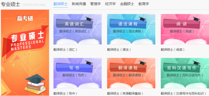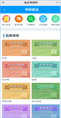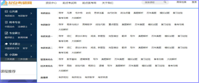 《起点考研网》的考研课程分为五大类,近30门课程。即包括考研公共课程、统考课、专业硕士、学术硕士、小语种等。