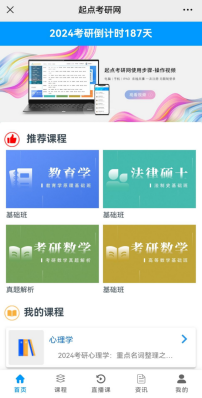 通过《起点考研网》,你可以读资讯,找准目标;看视频,强化学习;做试题,常规练习;多种功能支持实战演练,全面提高综合能力。