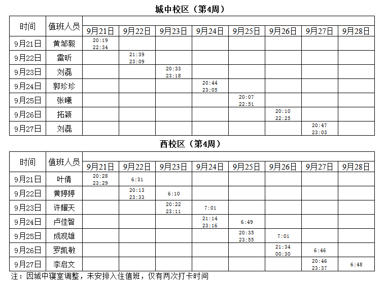 2020-2021学年第一学期第4周学工人员寝室值班通报