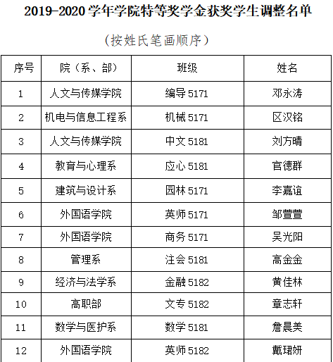 根据《yl7703永利集团学生奖学金评定及奖励办法》(文理行发[2020]20号)文件要求,经学生个人申请、院(系、部)推荐、学院学生资助管理中心材料核查、学生现场自述、学院评审小组评分,结合2019-2020学年国家奖学金的初评结果,按照国家奖学金和学院奖学金获得者以最高奖项计算、不重复发放的原则,经学院党政联席会研究通过,现将2019-2020学年学院特等奖学金获奖学生名单调整结果予以公示,如对结果有异议,请实事求是、客观公正地向学院反映。