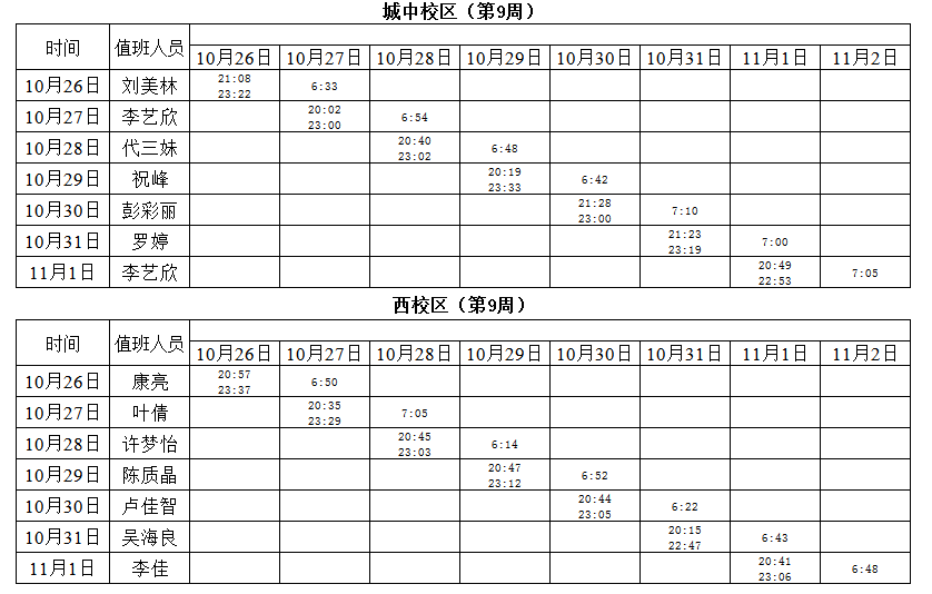 2020-2021学年第一学期第9-10周学工人员寝室值班通报