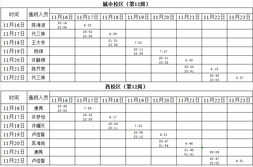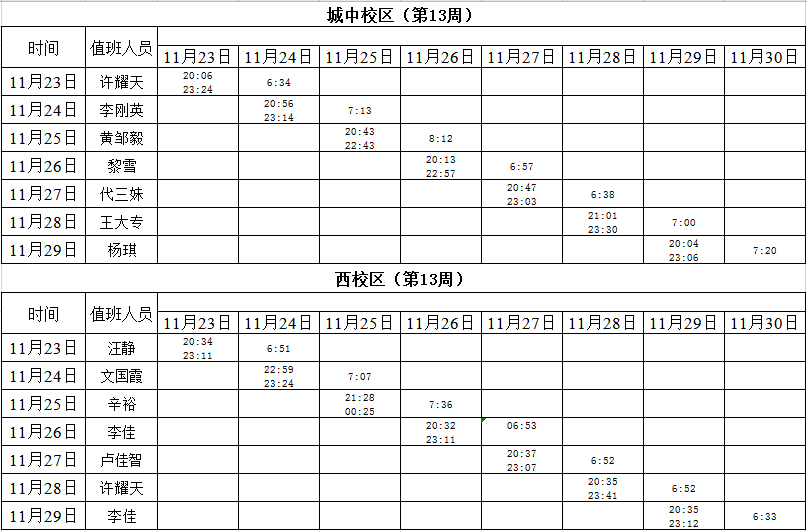 2020-2021学年第一学期第11-13周学工人员寝室值班通报