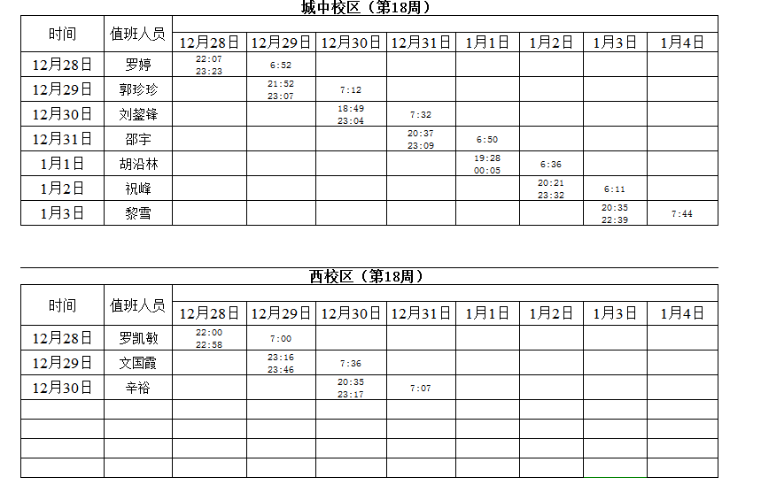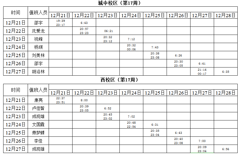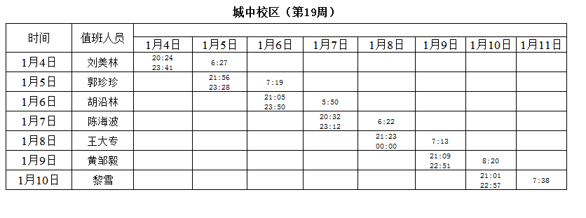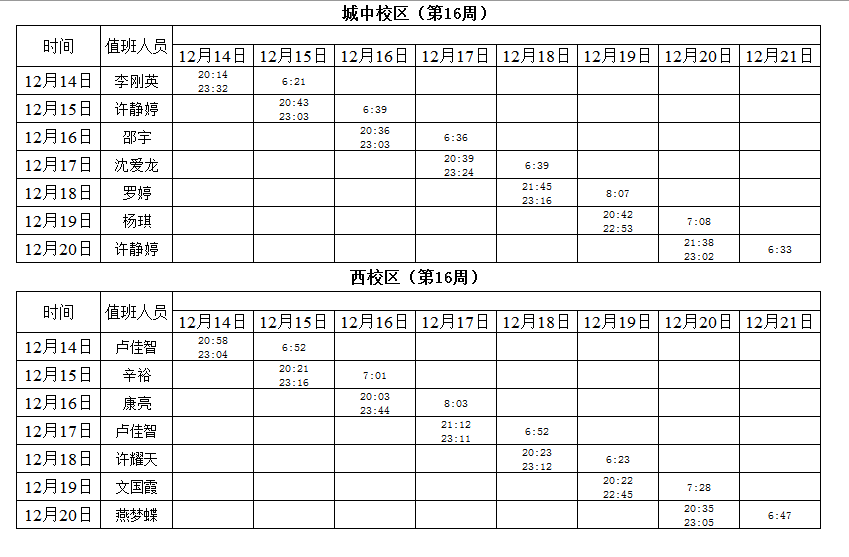 2020-2021学年第一学期第16-19周学工人员寝室值班通报