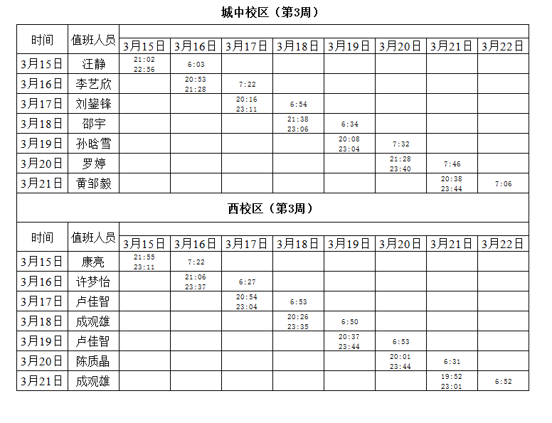 2020-2021学年第二学期第3周学工人员寝室值班通报