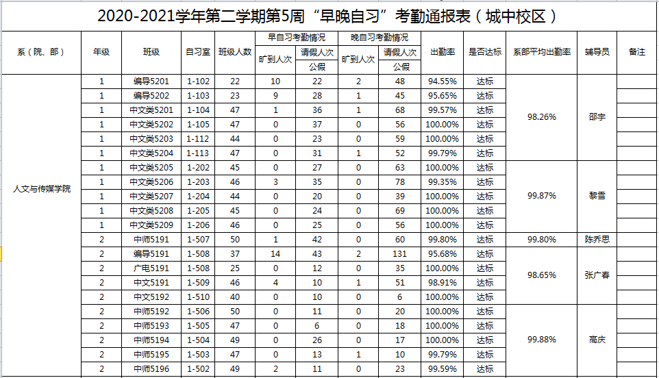 2020-2021学年第二学期第5周系(院、部)早晚自习考勤通报
