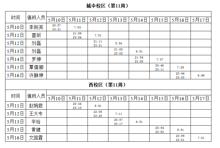 2020-2021学年第二学期第11周学工人员寝室值班通报