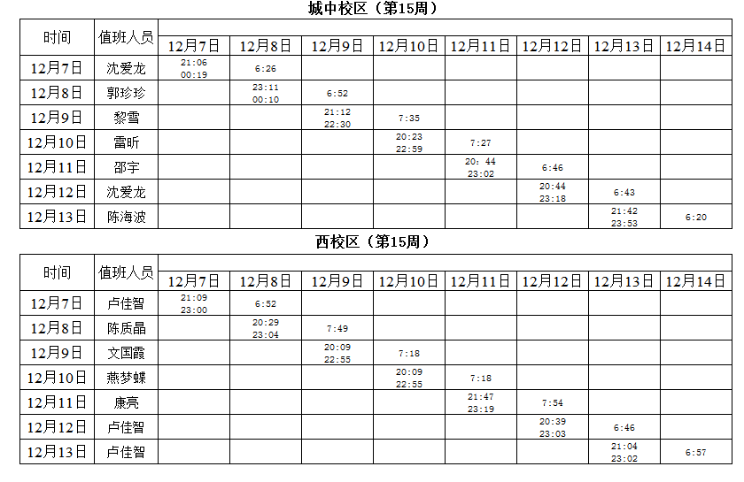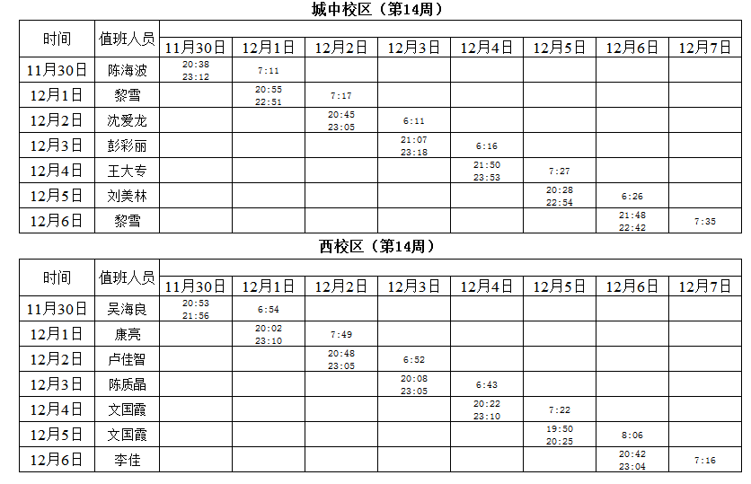 2020-2021学年第一学期第14-15周学工人员寝室值班通报