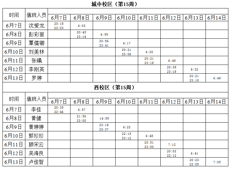 2020-2021学年第二学期第15周学工人员寝室值班通报