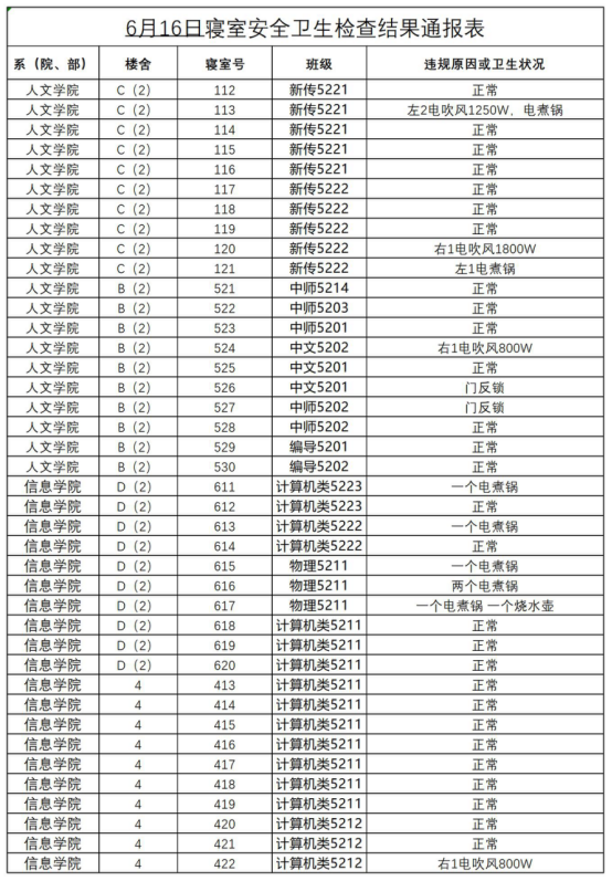 2022-2023学年第二学期第十八周寝室安全卫生检查结果通报