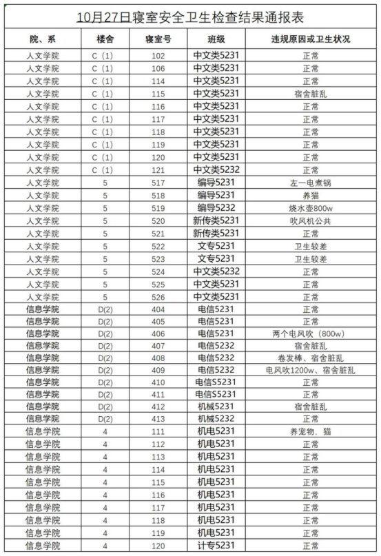 2023-2024学年第一学期第九周寝室安全卫生检查结果通报