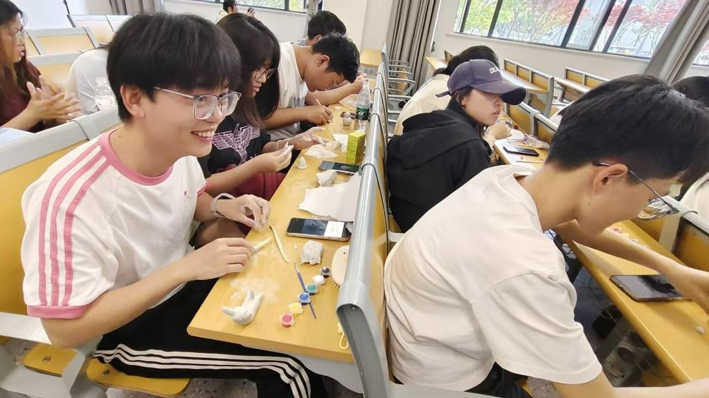 活动伊始,通过精彩的讲解与展示,主持人带领同学们深入了解了荆州的悠久历史文化、著名的名胜古迹,还分享了当地特色的生活风貌及美食娱乐等,让同学们对这座古城有了更全面深刻的认识。随后,活动进入核心环节 —— 体验荆州非遗文化郢城陶泥制作技艺,同学们充分发挥自己的创造力和动手能力,亲身体验陶泥制作的乐趣,感受非遗技艺的独特魅力。