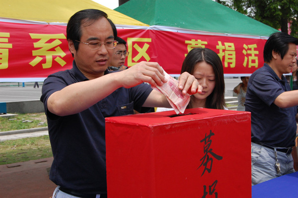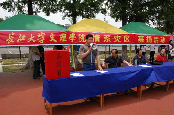 为了发扬人道主义精神,汇具文理人的无限真情。5月14日学院团委组织了“情系灾区、抗震救灾”大型募捐活动。中午12时募捐启动仪式在老篮球场举行,学院副书记汪邦柱宣读了募捐倡议书。随后在全院领导、教职工的带领下,在场的同学纷纷自发进行了捐款,在此次启动仪式上共捐得资金14000余元。结束后,老师、同学们仍络绎不绝的赶来捐款,并不肯留下自己的姓名,他们表示用自己的点滴爱心,为灾区人民捐款,为灾区人民贡献绵薄之力是每一个中国人都应该做的。