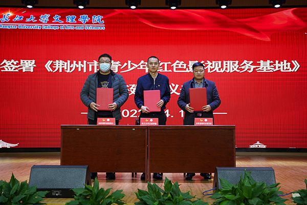 谭亮魁、张晓光和我院团委书记陈海波共同签署《荆州市青少年“红色影视”服务基地共建协议书》。瞿俊森和朱继平为“红色影视”服务基地揭牌。