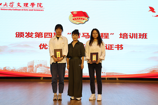 团委副书记郭珍珍宣读了表彰文件,学生工作部、党委宣传部、党委组织部、马克思主义学院相关负责人分别为结业学员代表、优秀班主任助理、第四期“青马之星”颁发证书,第五期青马班班主任、第四期“青马之星”学生代表登台发言。第四期、第五期“青马班”学员参加典礼。