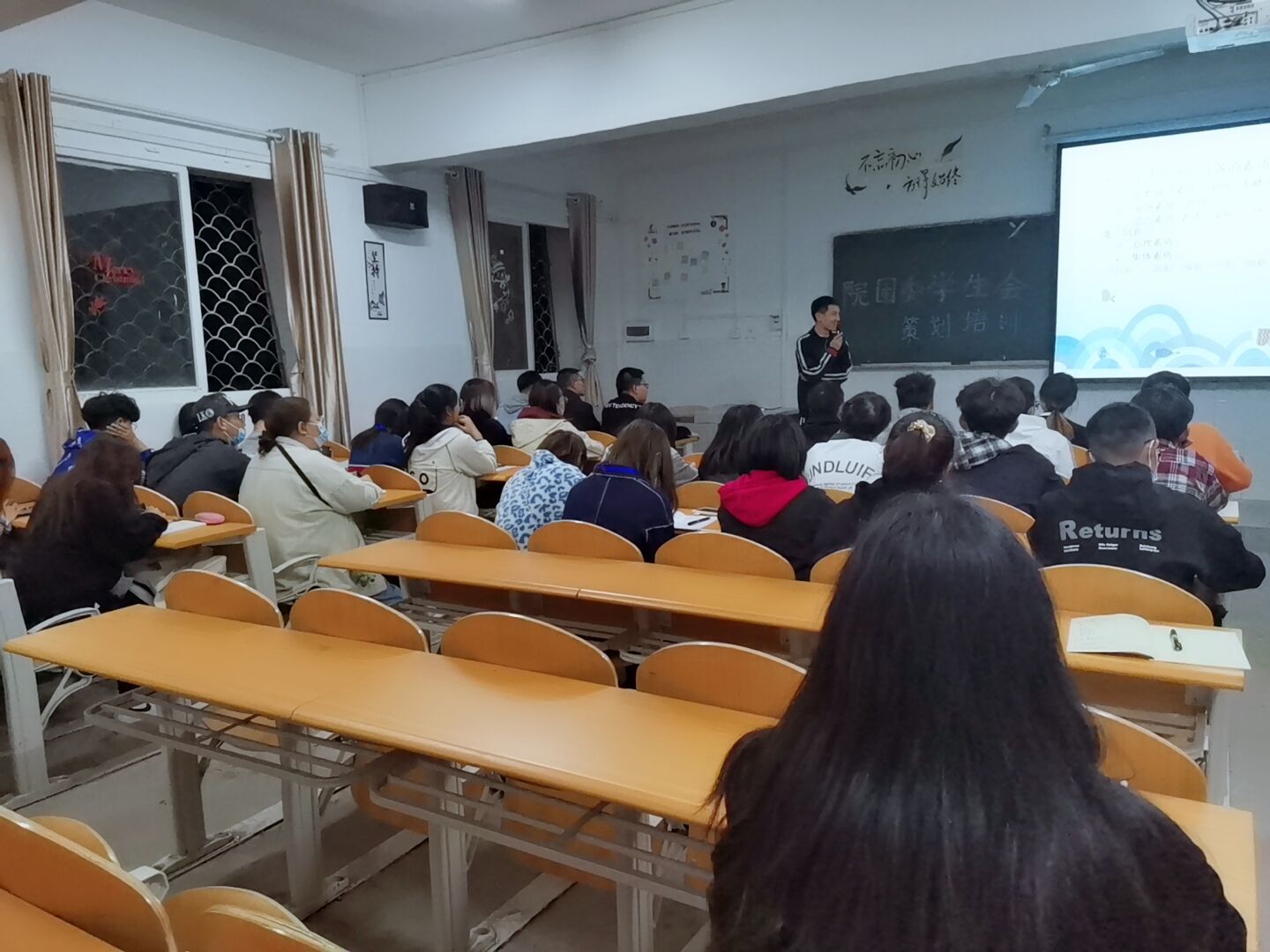 随后陈老师通过PPT为大家讲解如何写策划和总结,着重介绍了策划内容、应急预案和奖项设置,并要求学生干部们在写策划时做到六个要、四个美。同时教导大家要放心大胆去工作和做事,充分展示身为一名学生干部应有的担当和责任。