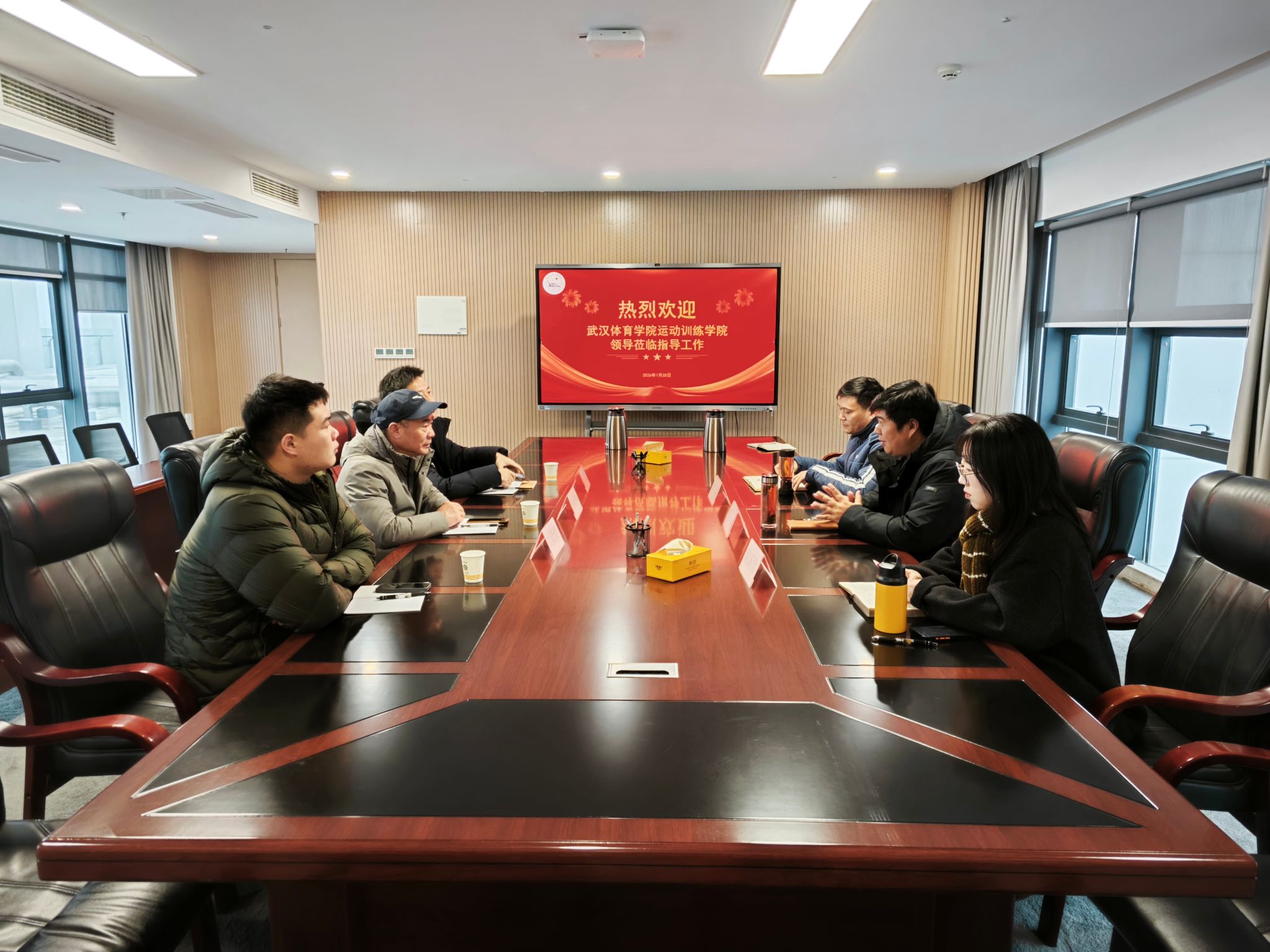 本网讯 1月25日上午,武汉体育学院运动训练学院党委书记姜长林、党委委员王十乐、学生会副主席刘昕煜一行莅临我院考察交流。我院体育系主任介博、党总支书记邹姜、党总支副书记赵婉君热情接待,双方围绕体育学科建设、人才培养等议题展开深入座谈,共话体育学科建设新路径。