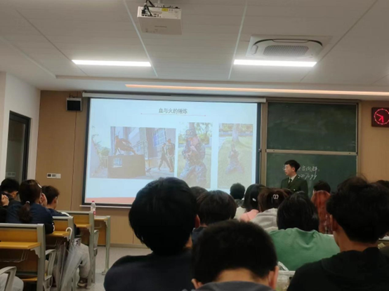 第二个部分就是由老兵团李自强同学宣讲有关征兵方面的内容。首先他给我们简单介绍了自己的亲身经历,其次他着重讲述了国防的意义,最后他详细的讲述了征兵的条件要求,应征入伍的基本流程和退役士兵的优惠政策。在不同的人心中,理想的青春有着不同的颜色。但选择参军入伍无疑是最鲜艳的红色。这不是对自己的一次挑战,更是一种突破。参军,可以使我们的能力得到淬炼,使我们的心智更加坚韧、成熟,我们更能在奋斗和拼搏中体会到人生的价值和意义。总之,选择参军报国是对国家的忠诚,是对青春的热爱,是一次无悔的选择。