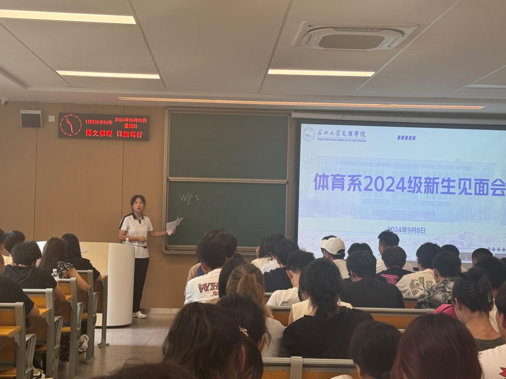 会议伊始,体育系主任介博代表全体师生对新生的到来表示热烈欢迎,并介绍了学校、体育系的基本情况。介主任从培养目标、培养要求、教学目标、课程设置、学位授予等多个方面对2024级新生进行了全面、详细的专业介绍,加深了同学们对专业的理解和认识。