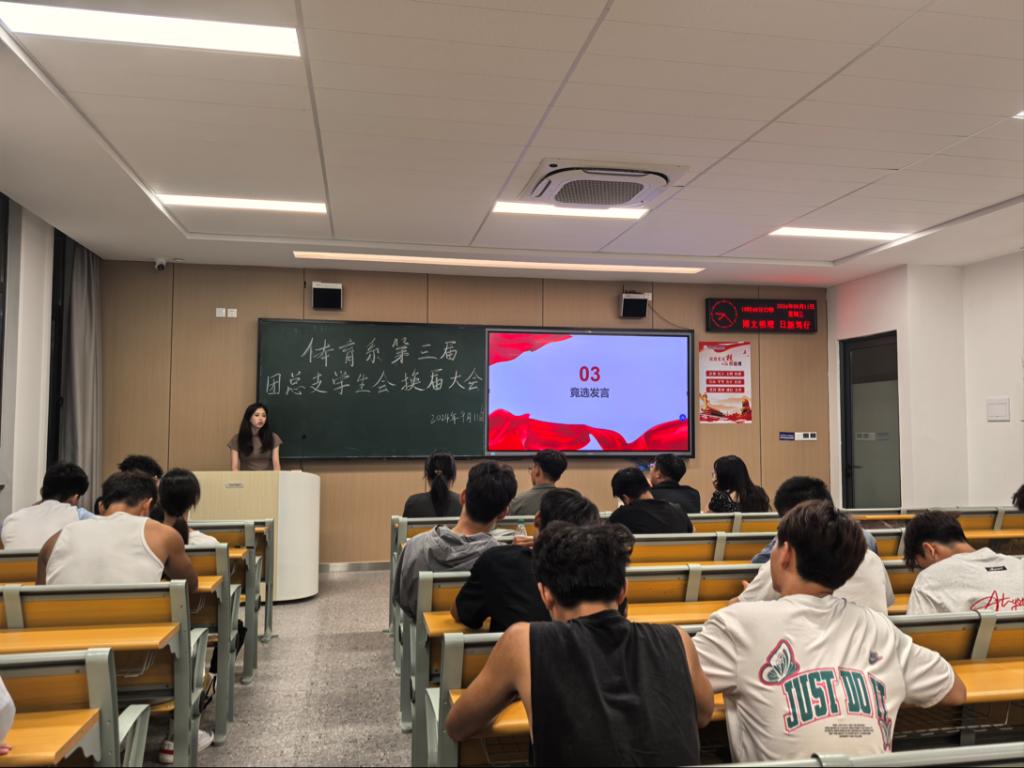 会议第三项,进行体育系第三届团总支学生会部门负责人竞选。各位竞选者上台陈述竞选理由,表明自己工作的态度和未来的工作计划。