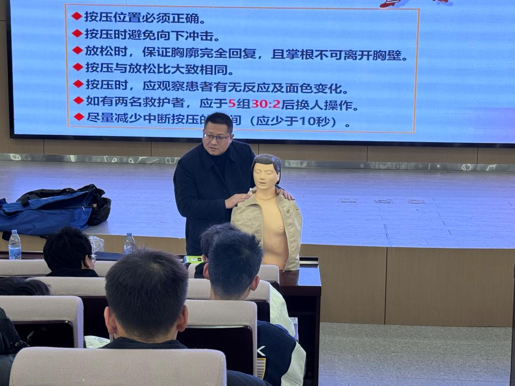 此次培训由红十字会副会长熊坤主讲,从红十字会的起源、发展过程、心肺复苏知识、创伤救护等方面进行讲解,并对心肺复苏进行现场实践操作演示。随后,学生们纷纷上前,在工作人员的指导下进行了心肺复苏实践操作练习。