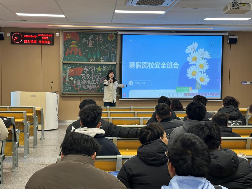 辅导员杨漫老师围绕交通安全、人身安全、财产安全及网络安全四大主题,通过PPT演示、视频案例分析及现场互动问答等多种形式,深入浅出地为学生们讲解了离校期间可能遇到的各种安全隐患及应对策略。她特别提醒学生们,在离校途中要遵守交通规则,不乘坐非法营运车辆;在公共场所要保管好个人财物,避免携带过多现金和贵重物品;在网络空间中要保护个人隐私,不轻信陌生人的信息,不随意点击不明链接。