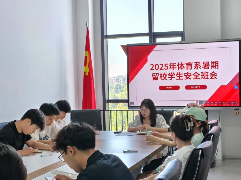 本网讯(通讯员 柯淑霞)2025年7月3日下午4点,体育系在会议室开展2025年暑期留校学生安全教育班会。本次班会由体育系党总支副书记赵婉君主持,28名暑期留校学生参加。