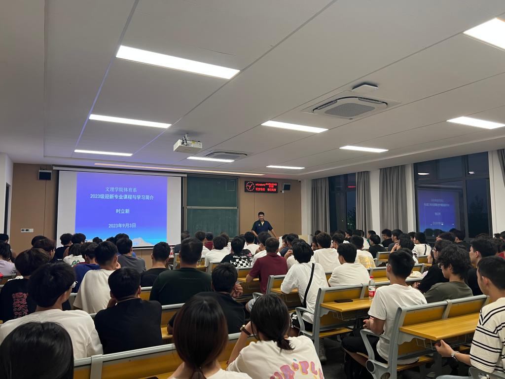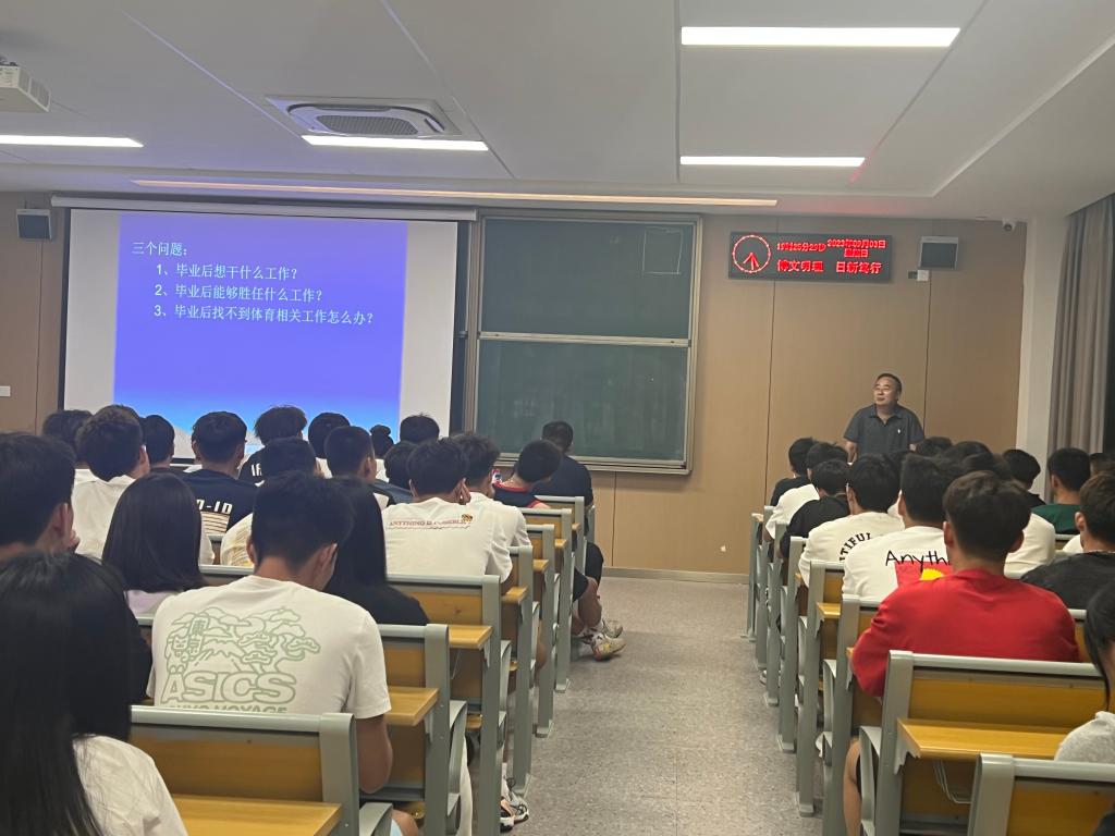 会议第二项,由时立新教授为体育系2023级全体学生做专业介绍宣讲。时教授从三个问题导入、讲述了两个故事,并就体育系课程设置、学生学习策略等多个方面为同学进行了深刻讲解,同学们聚精会神,纷纷表示,在新的起点上,我们一定不会辜负党和国家的培育,不辜负老师与家长的期盼,坚定理想信念,创造无悔青春!
