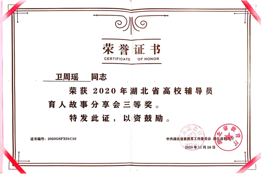 卫周瑶,yl7703永利集团外国语学院2007级英韩双语专业5072班,2011届毕业生。现任武汉纺织大学会计学院学工办主任,团委书记。曾荣获2020年湖北省高校辅导员育人故事分享会三等奖等各项荣誉。