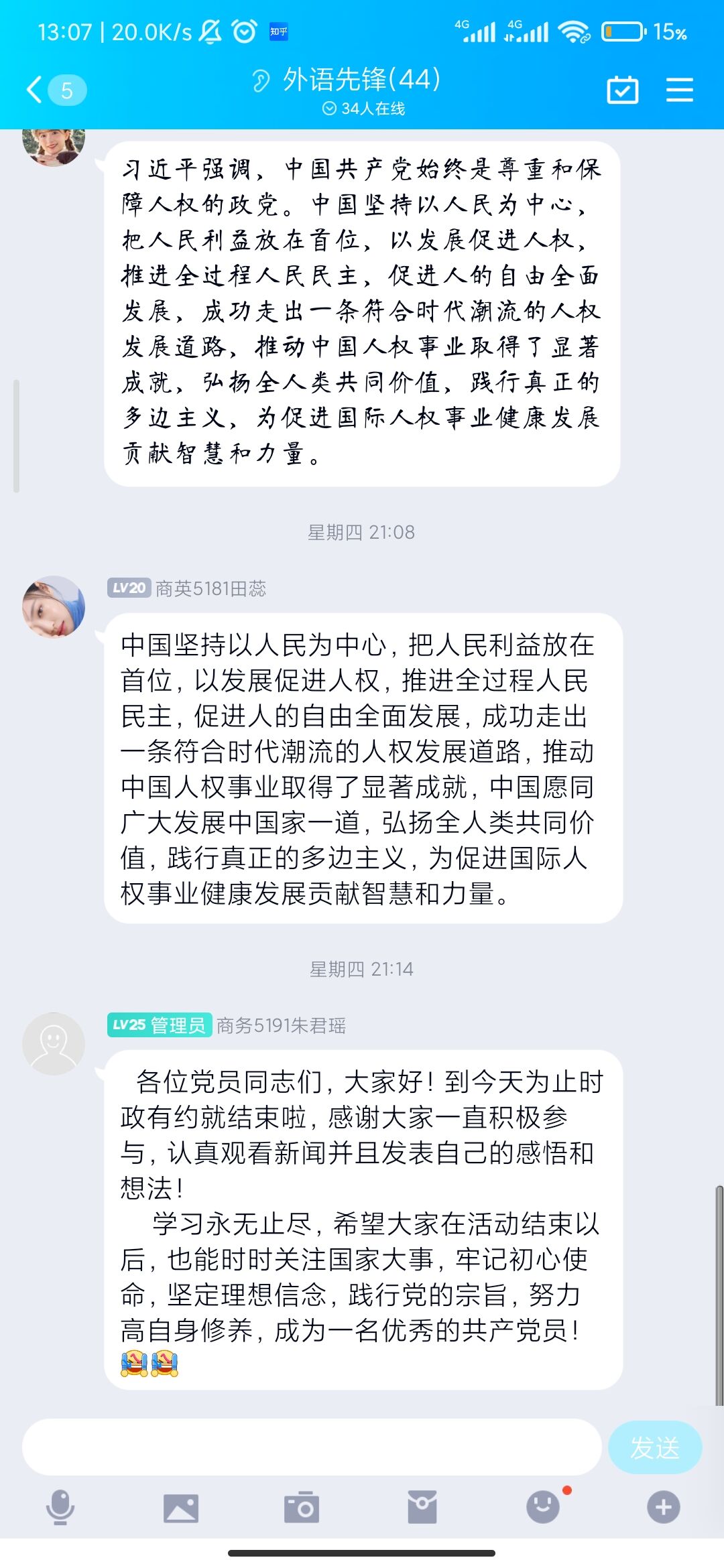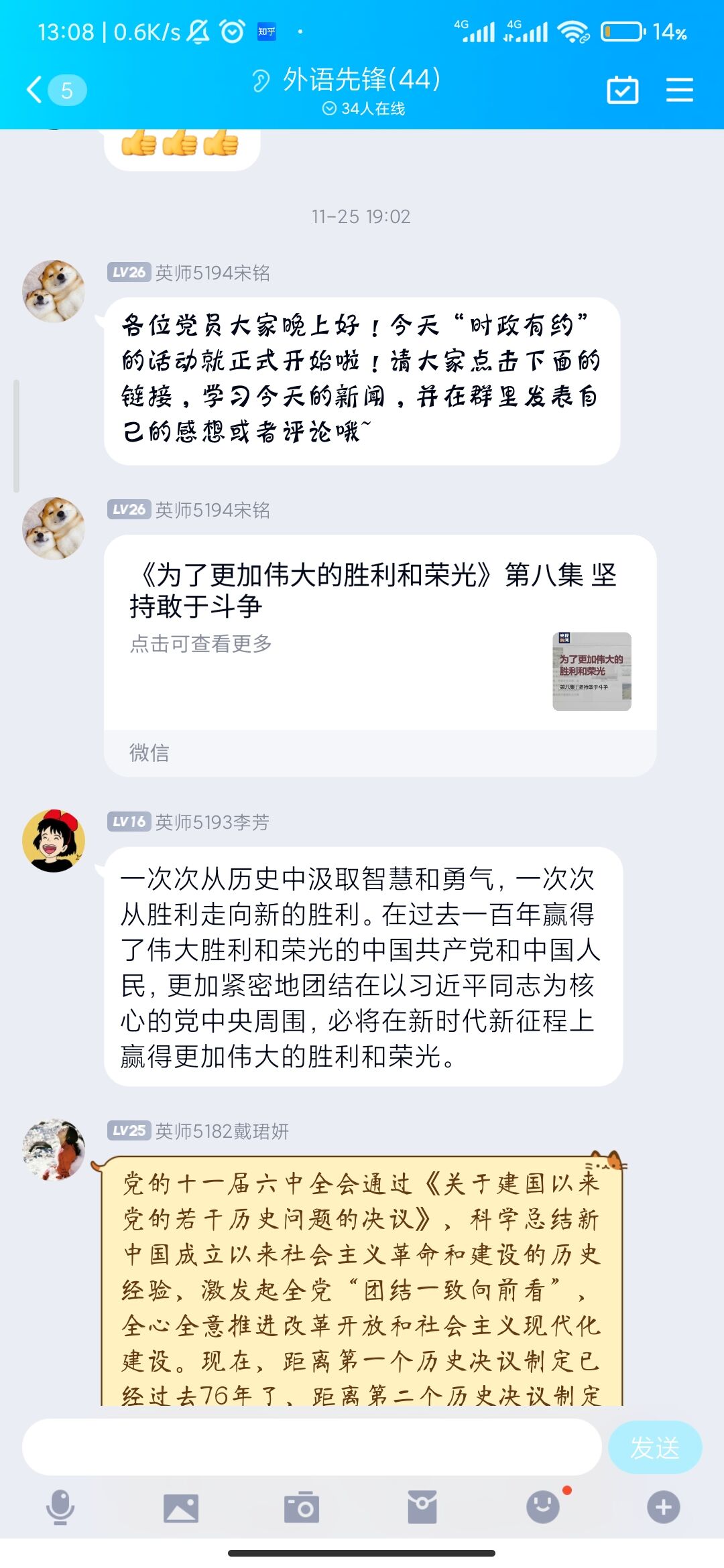 为提高政治觉悟,发挥党员的先锋模范作用,外国语学院学生党支部自10月11日起开展了“时政有约”特色主题活动,首先由主持人在群内发送近日的国家时政大事或重压文件供大家学习,各位党员同志观看完后在群内发表感想和感悟。活动历时两个多月,在12月9日落下帷幕。期间以“习近平总书记出席第二届联合国全球可持续发展交通大会开幕式并发表主旨讲话”、“中国共产党第十九届中央委员会第六次全体会议公报”、“习近平总书记向2021从都国际论坛开幕式发表视频致辞”等主题进行讨论。
