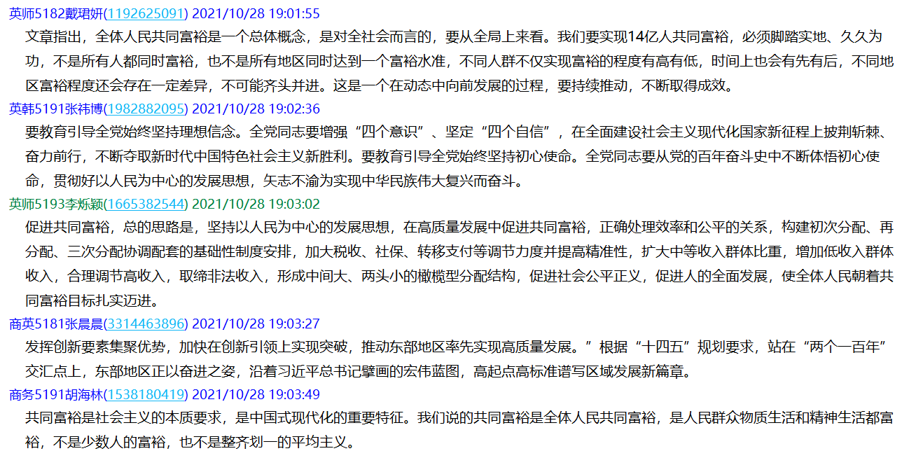 通过本次学习,增强了党员对共同富裕的了解,提升了党员的知识储备,保持了党员的先进性。作为大学生党员,我们要认真学习时政要闻,积极主动更新自己,保持思想先进,从而在思想和行动上不断向党靠拢。