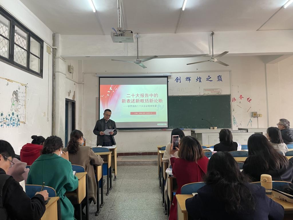 随后,刘美林书记以“二十大报告中的新表述新概括新论断——学贯党的二十大会议精神党课”为题,为全体党员上了一堂生动的党课。习近平总书记在二十大报告中,提出一系列新表述新概括新论断。就大会报告中提到“三个务必”、“三件大事”、“中国式现代化的五个特色”、“中国式现代化的本质要求”等内容进行了详细讲解。