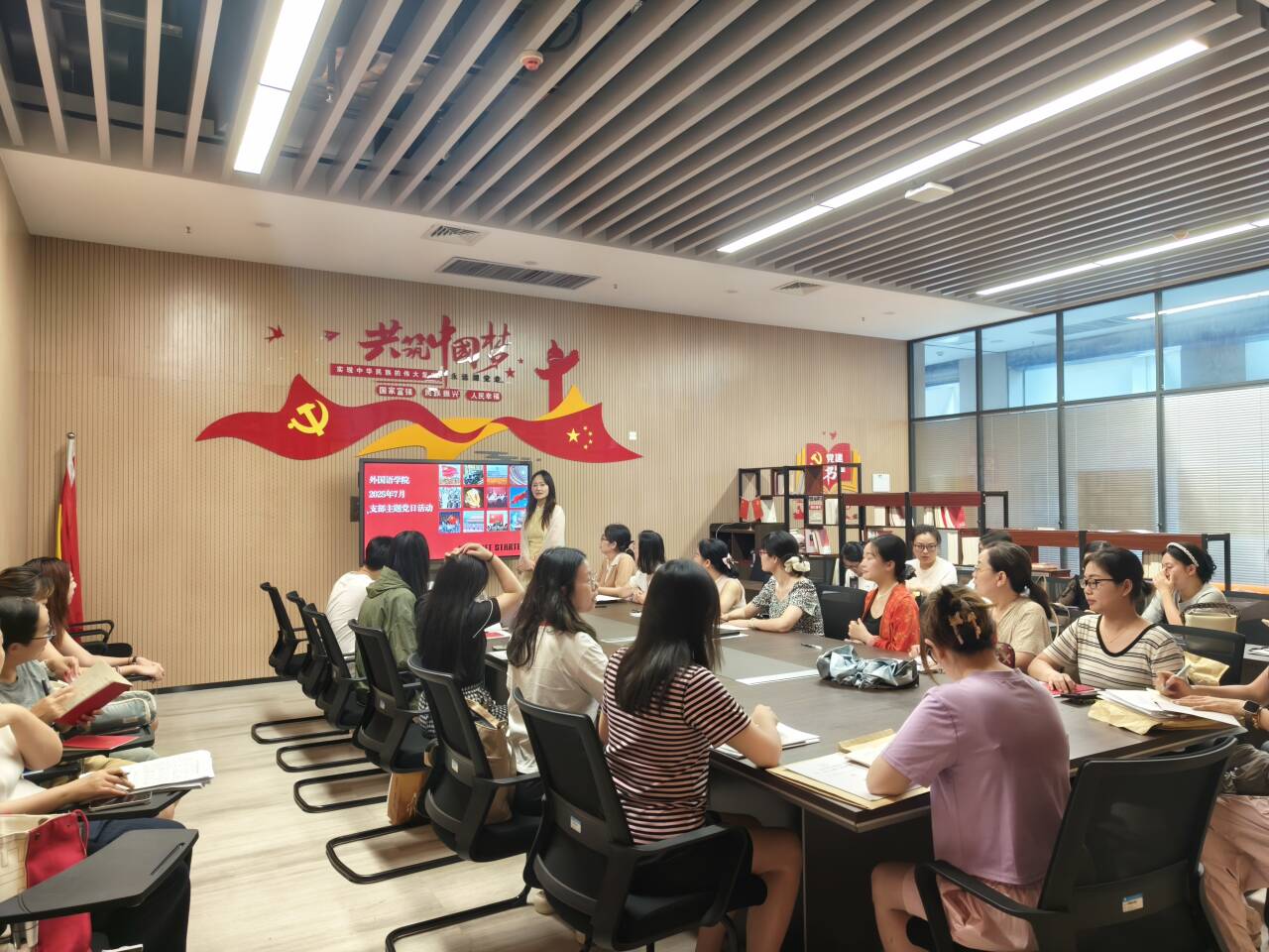 本网讯(通讯员 许静婷)7月10日下午,外国语学院于图书馆526会议室召开7月支部主题党日活动。会议由王玲玲书记主持,全体教师参加。