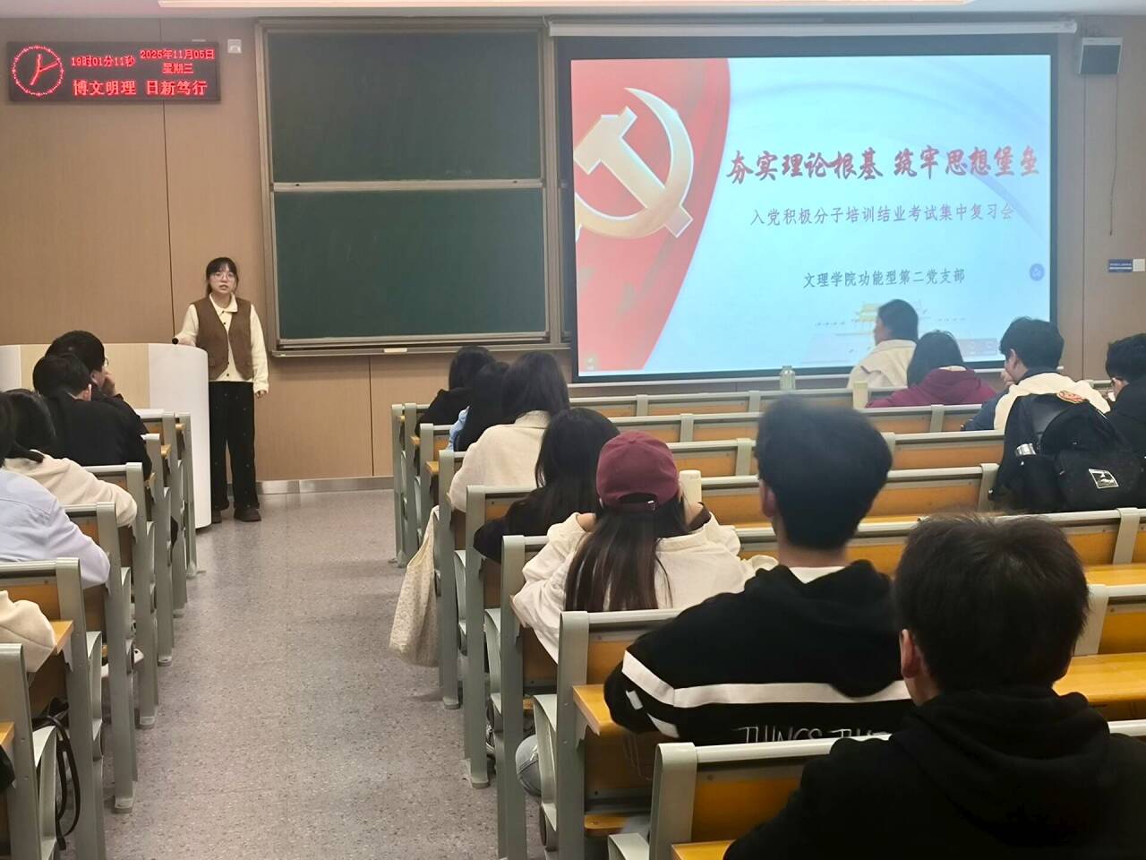 本网讯(通讯员鄢语彤)为加强入党积极分子综合素质,11月5日晚上19点,yl7703永利集团功能型第二党支部在教学楼A-308组织开展了入党积极分子培训结业考试集中复习会。会议由支部书记许静婷老师主持,全体入党积极分子参与。