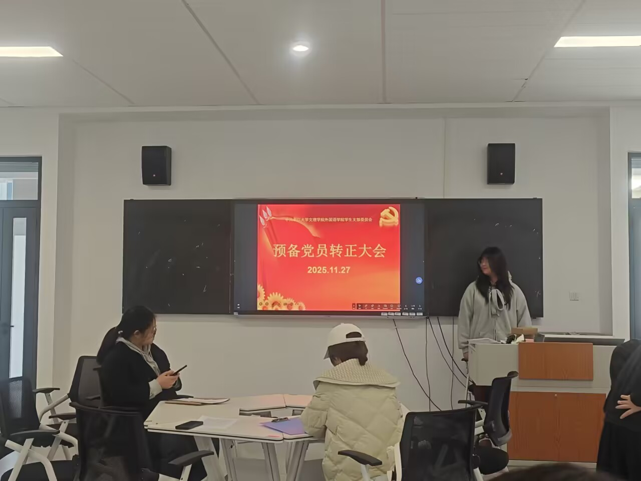 本网讯(通讯员 黄可欣)2025年11月27日下午14点30分,外国语学院学生党支部于02-C-414教室召开张前程等6名预备党员转正大会,本次大会围绕张前程等6名同志成为正式党员展开讨论。出席本次大会的有外国语学院学生党支部书记刘鋆锋,辅导员老师以及学生党支部全体成员。