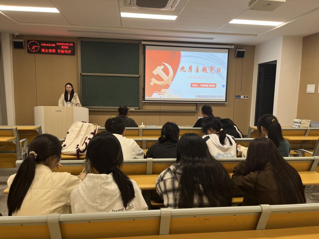 本网讯(通讯员 陈依依)2025年9月18日下午15:00 外国语学院学生党支部在教室C-324开展九月主题党日和政治学习。此次活动由张会斯涵同志和陈依依同志共同主持。