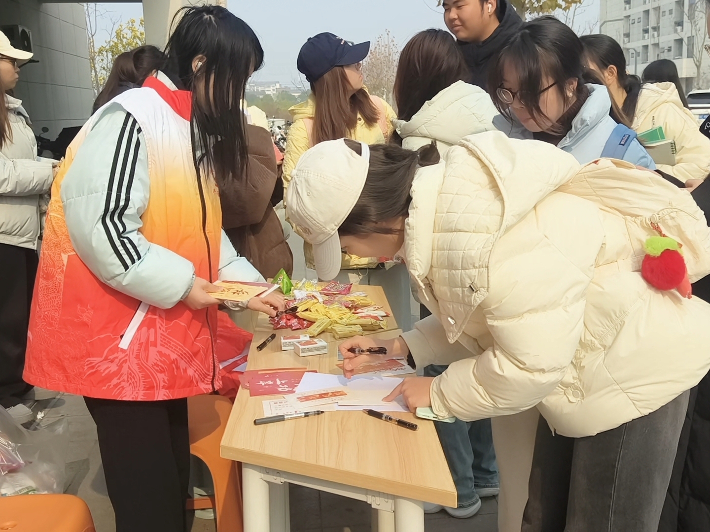 活动期间,党员志愿服务队在B、D宿舍楼下设置““赠言寄暖,助力研途””服务点,将“党建+暖心祝福”融入细节。吸引过往同学纷纷驻足,提笔在祝福卡上为考研学子写下真挚鼓励。有人结合亲身经历寄语:“坚持到底,每一步努力都算数”;有人写下:“笔锋所至,心之所向”;还有人绘上生动图案,附上“执笔为剑,前程灿烂”的祝愿,方寸之间传递温暖。这些承载真情的手写卡片经志愿者整理后,被悉心放入“考研暖心礼包”,将组织的温暖与同窗的祝愿一同送达考研学子手中。