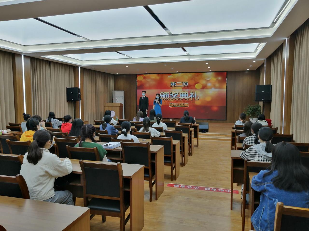 本次颁奖典礼由外国语学院团总支学生会文艺部部长虢娜和组织部副部长王昊洋主持,共三项内容:致开幕词、获奖代表上台领奖、主席田蕊上台发言并致闭幕词。
