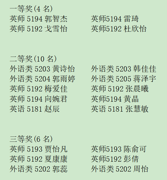 至此,本次“光影声色”英语配音大赛决赛圆满结束,经过数据统计,最终确定如下获奖名单: