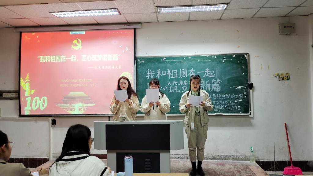 (通讯员 万紫寒)4月1日晚上7点,为大力弘扬中华优秀传统文化,追寻激情燃烧岁月的温暖回忆,外国语学院团总支学生会于一教308教室举办以“我和祖国在一起,匠心筑梦谱新篇”为主题的红色经典朗诵大赛初赛。此次活动面向全体大一、大二成员。