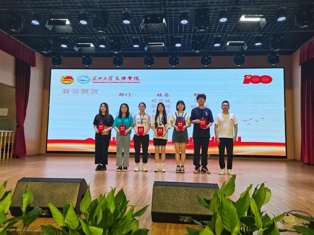随后,副书记刘鋆锋老师,辅导员黄邹毅和许静婷老师分别为各部门成员颁发聘书并合影留恋。副书记杨星宇宣读新一任学生会干部名单,同时希望大家能够积极开拓,勇于创新,为外国语学院带来蓬勃向上的新风貌。