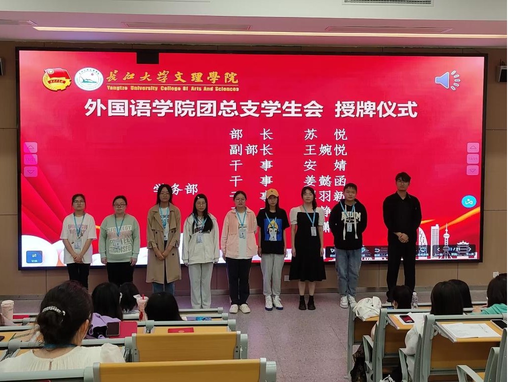 随后,副主席齐慕子宣读关于《2023-2024学年外国语学院团总支学生干部任职决定》的文件。在场老师为新一届学生会成员授牌。