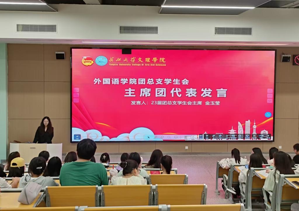 大会伊始,23届学生会副书记吴雪萍就2022-2023学年外国语学院团总支学生会学生工作进行展示;主席金玉莹发表讲话,并表达了对学生会的殷切期望。