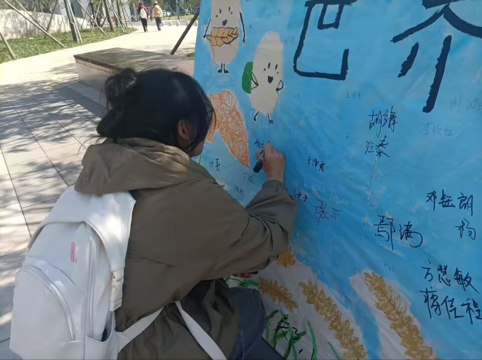 本网讯(通讯员 杨宇轩)11月7日,外国语学院团总支学生会青工部组织同学们于B栋宿舍楼前举办世界勤俭日签字活动。